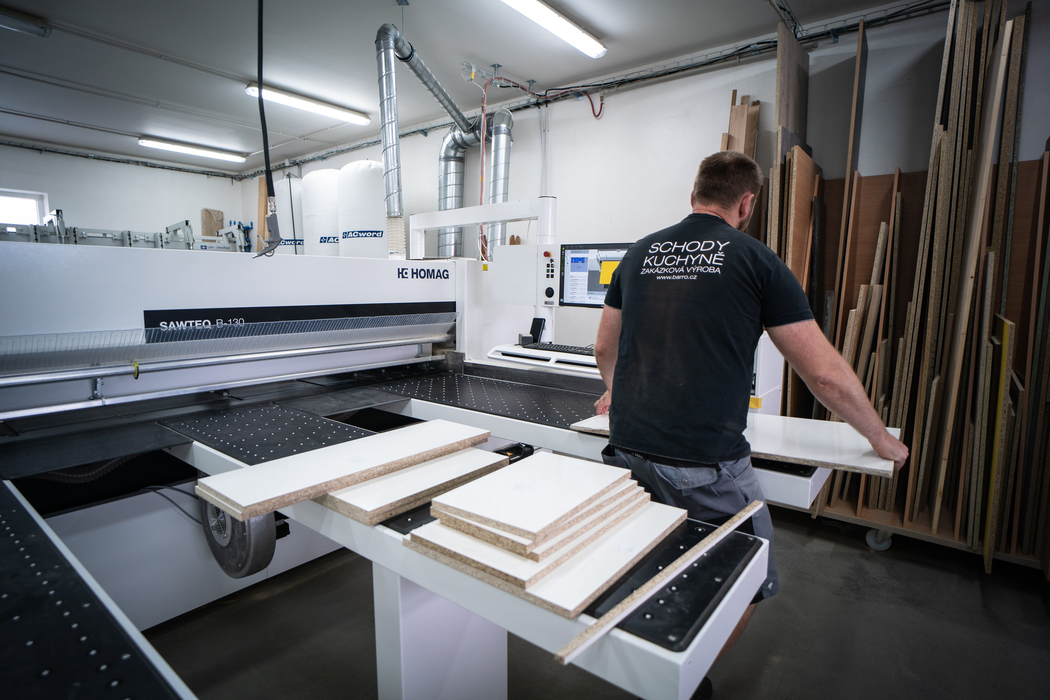 Díky technologicky vyspělé strojní ose je základní výroba interiérů, nábytku či kuchyňských linek rychlá a rutinní záležitost, ale v BARRO si skvěle poradí třeba i s výrobou dřevěných a kombinovaných schodišť.