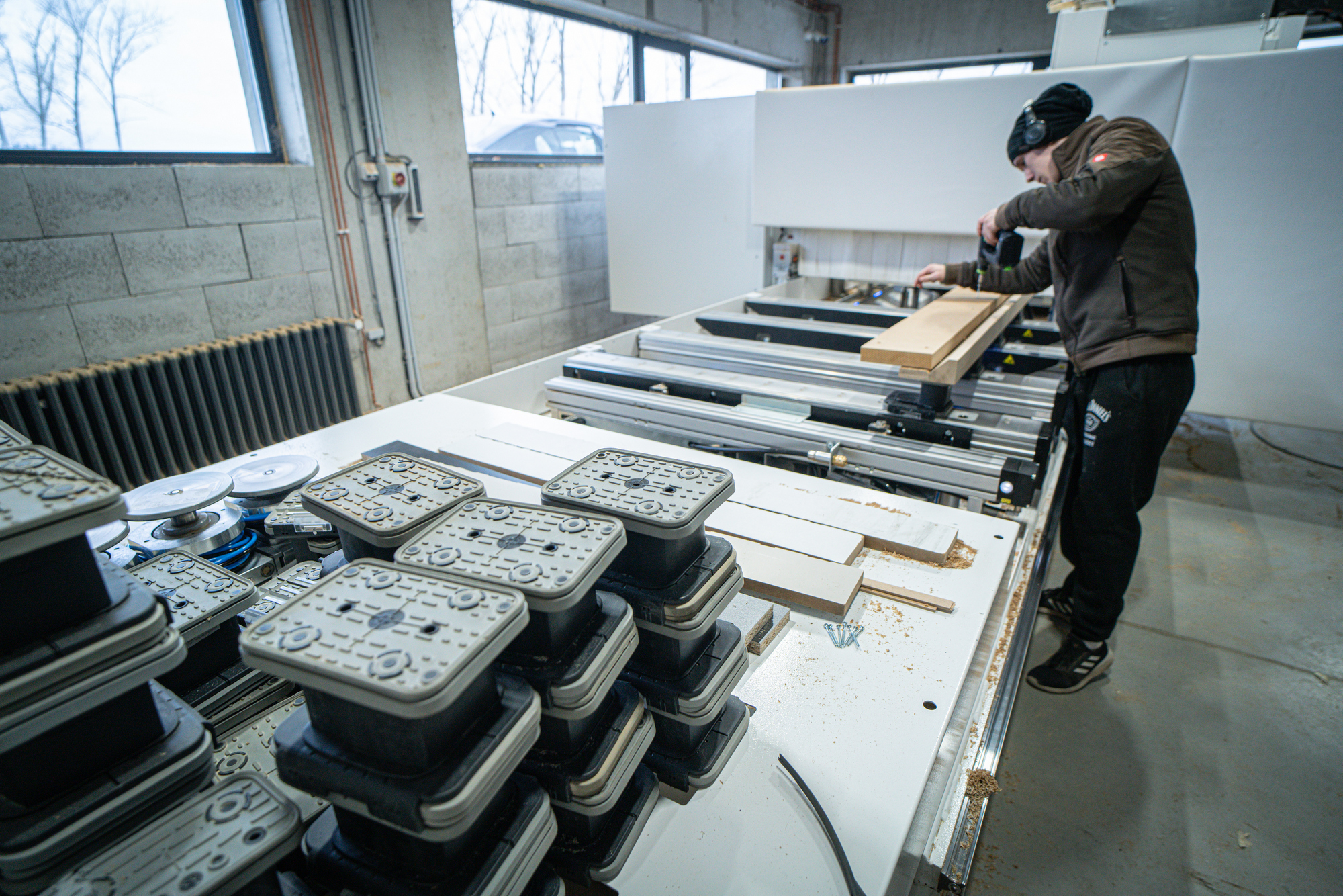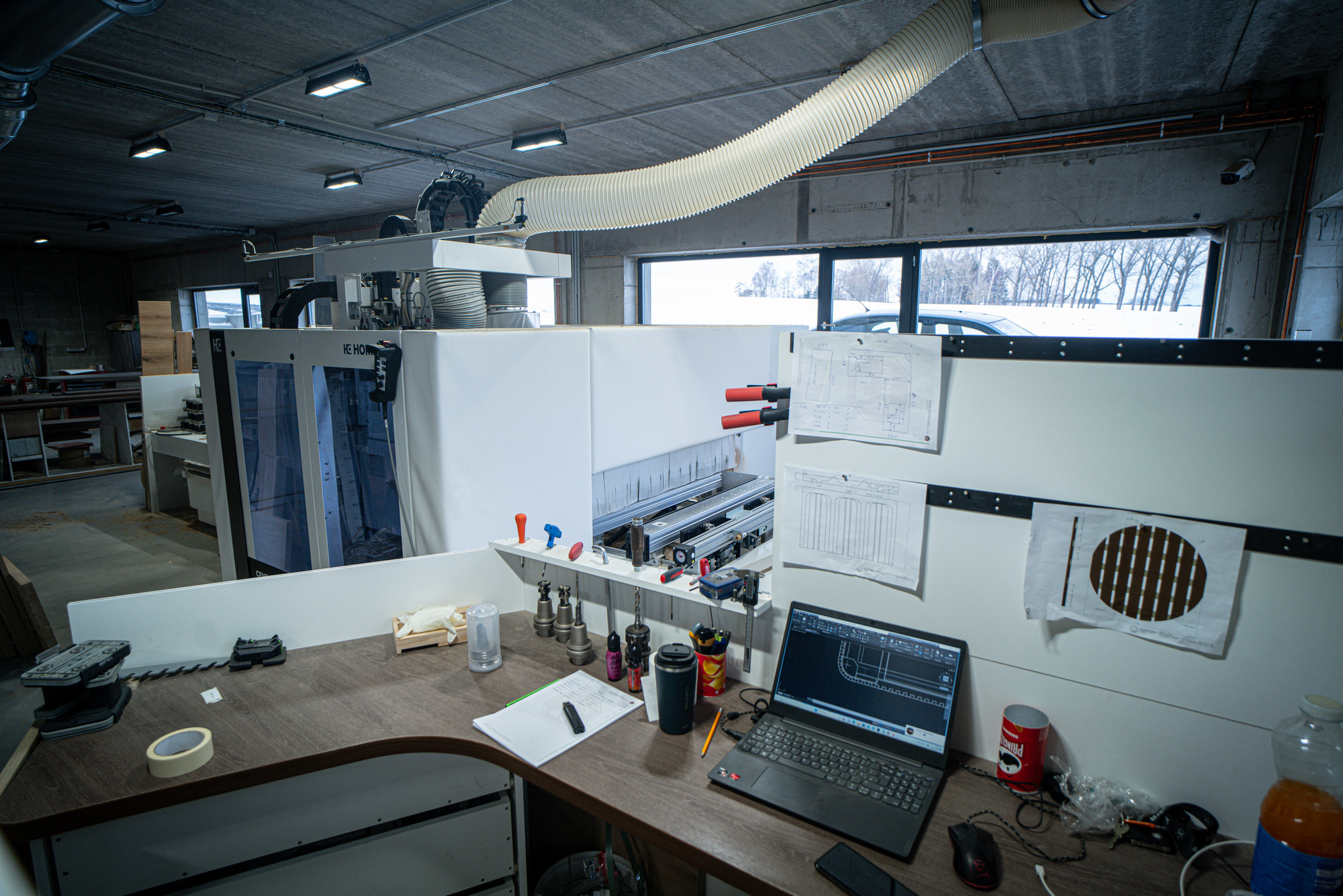 Mezi nejnovější stroje, které zde obsluhuje sehraný tým až téměř 35 lidí, se řadí 5osé obráběcí centrum HOMAG CENTATEQ P-210 a olepovačka HOMAG EDGETEQ S_300 se zpětným dopravníkem LOOPTEQ. Právě HOMAG je u výroby u Fenclů spolehlivým řešením a sázkou na jistotu – v provozu funguje již mnoho let také velkoplošná pila Holzma HPP 250 a obráběcí centrum Weeke Venture 3L.